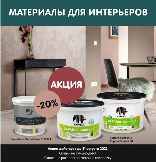Объявляем скидку 20% на выделенный ассортимент фасадных и интерьерных материалов Caparol! Скидка действует до 31 августа 2022 года в салоне ПРЕМИУМ Декор и интернет-магазине www.premiumdecor.by.