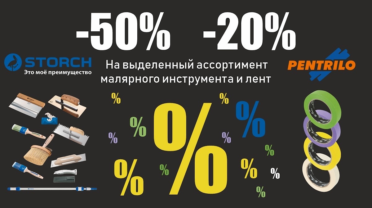 Объявляем распродажу выделенного ассортимента малярного инструмента STORCH со скидкой 50% и малярных лент Pentrilo со скидкой 20%!