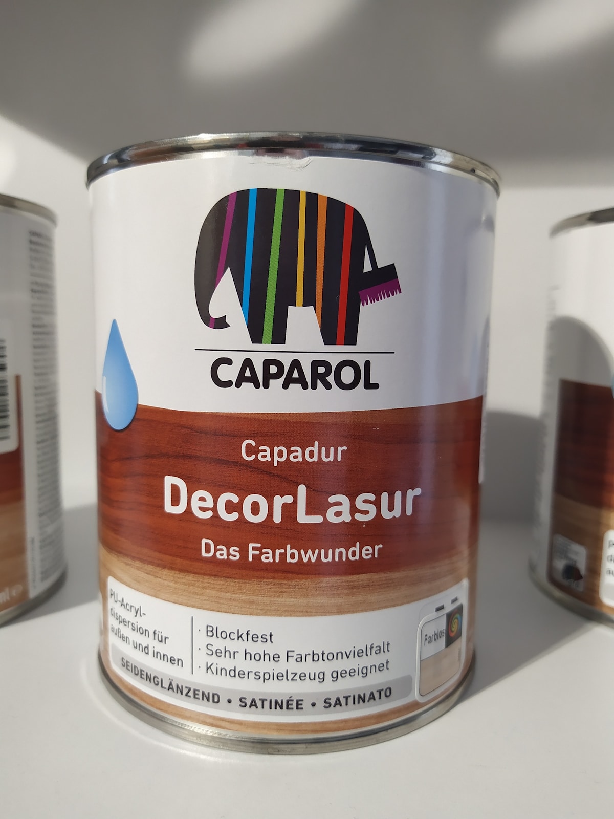 Некоторые цветовые тона условно подходят для наружного применения. Информацию об этом можно получить на станциях колеровки ColorExpress. Бесцветная лазурь Capadur DecorLasur применяется только в качестве грунтовки под цветную лазурь или как финишный слой на темную лазурь, т. к. иначе нельзя гарантировать достаточной защиты от ультрафиолетовых лучей. На внешних поверхностях, подверженных атмосферной коррозии, нельзя использовать бесцветную лазурь.