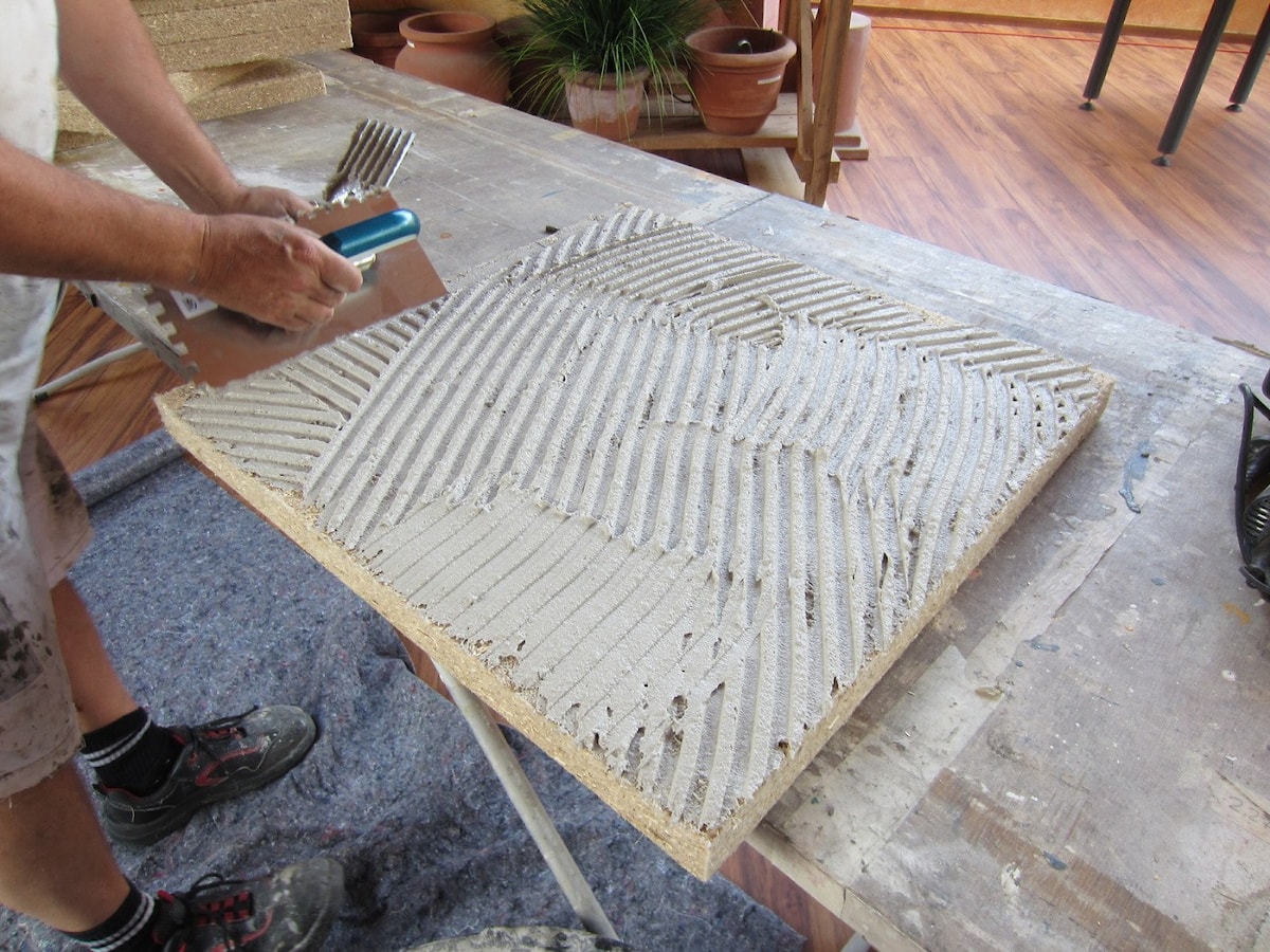 Клеевой состав наносится с помощью кельмы из нержавеющей стали точечно-бортовым методом (полосы шириной по 5 см по периметру плит и дополнительно 2-3 «лепешки» размером с ладонь в центральной части плит) или полноповерхностно. После прижимания теплоизоляционного материала к основанию контактная