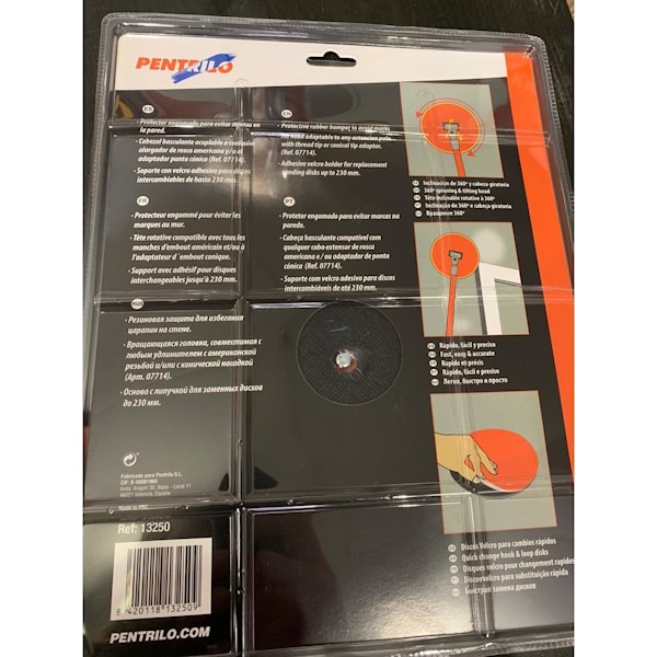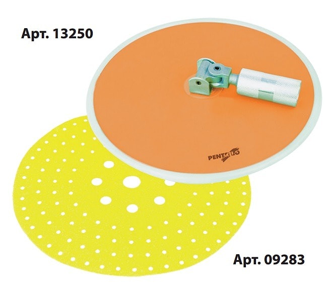 | Ручной пад Pentrilo для шлифования. Диаметр 225 см. Резиновая защита, чтобы избежать царапин на стенах, вращающаяся головка, совместимая с любым удлинителем с американской резьбой и/или с коническим адаптером (Арт. 0771). Основа на липучке для сменных дисков до 230 мм. Арт. 13250 |