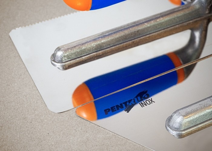 Трапецевидная кельма Pentrilo изготовлена из нержавеющей стали. Размеры инструмента: 0,6 мм, полотно 240 x 100 мм.