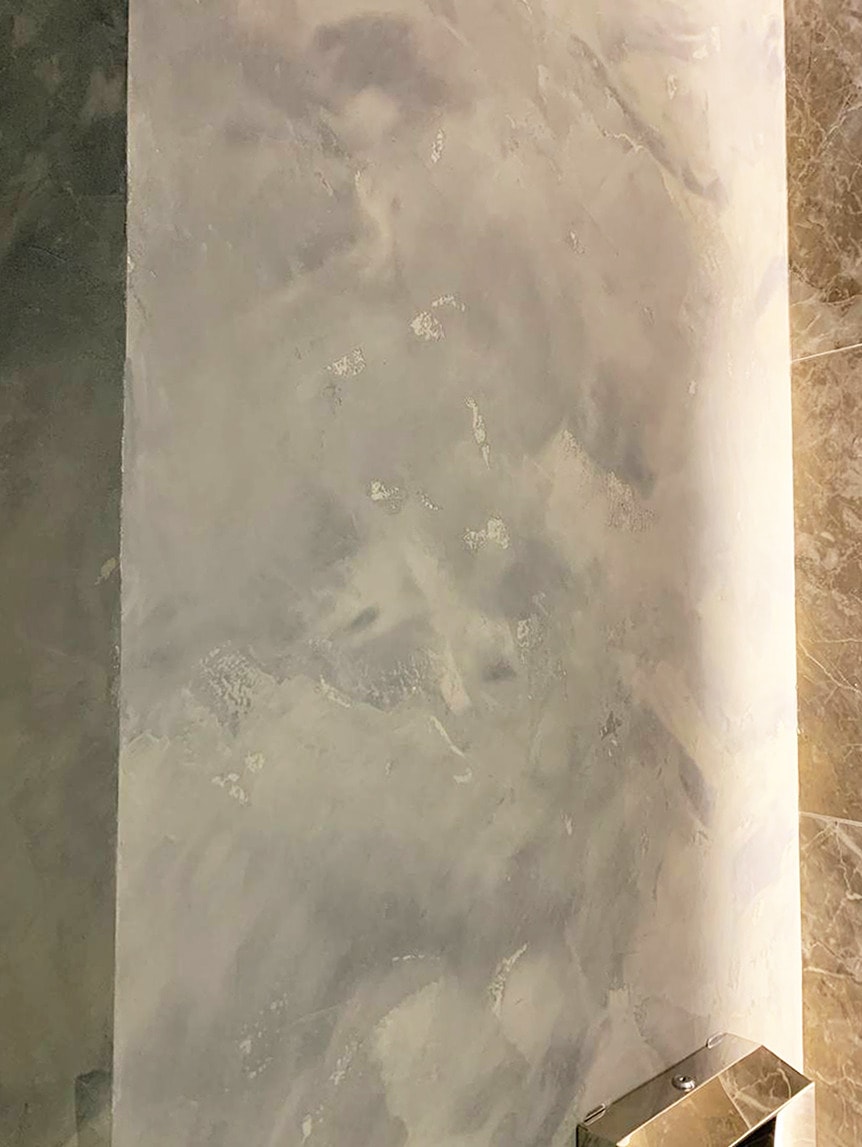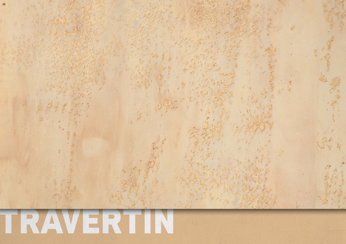 Схема создания эффекта «травертин»: с помощью кельмы из нержавеющей стали нанесите равномерный слой штукатурки на поверхность, затем обработайте невысохшее покрытие «тампующими» движениями кельмой либо пластиковой теркой. Через 30-40 минут, по мере подсыхания материала, пригладьте и утрамбуйте покрытие металлической кельмой.