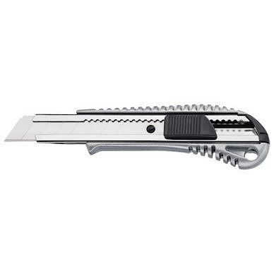 Широкий алюминиевый нож с отламывающимся лезвием. Удобная алюминиевая ручка с металлической направляющей и автоматической фиксацией лезвия.