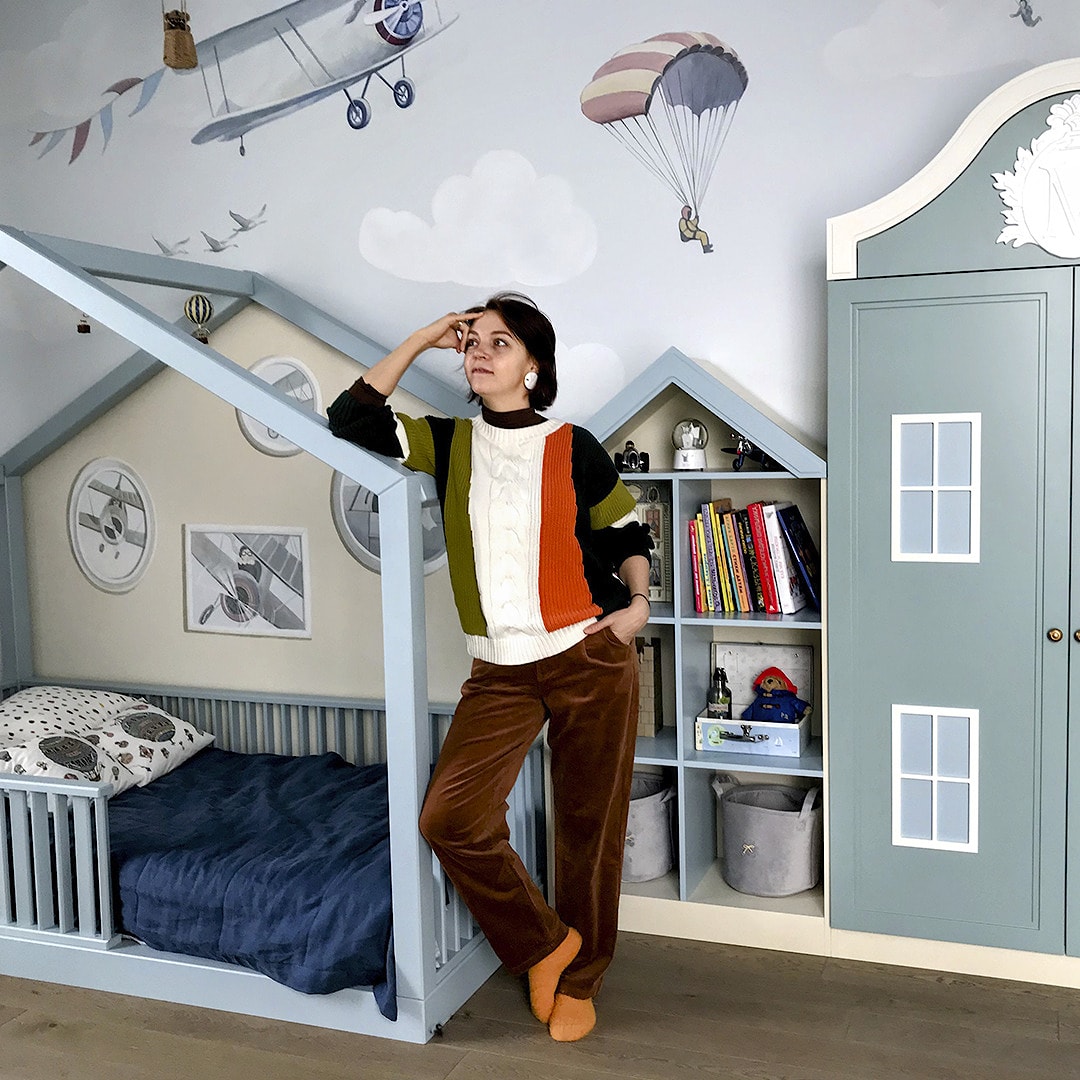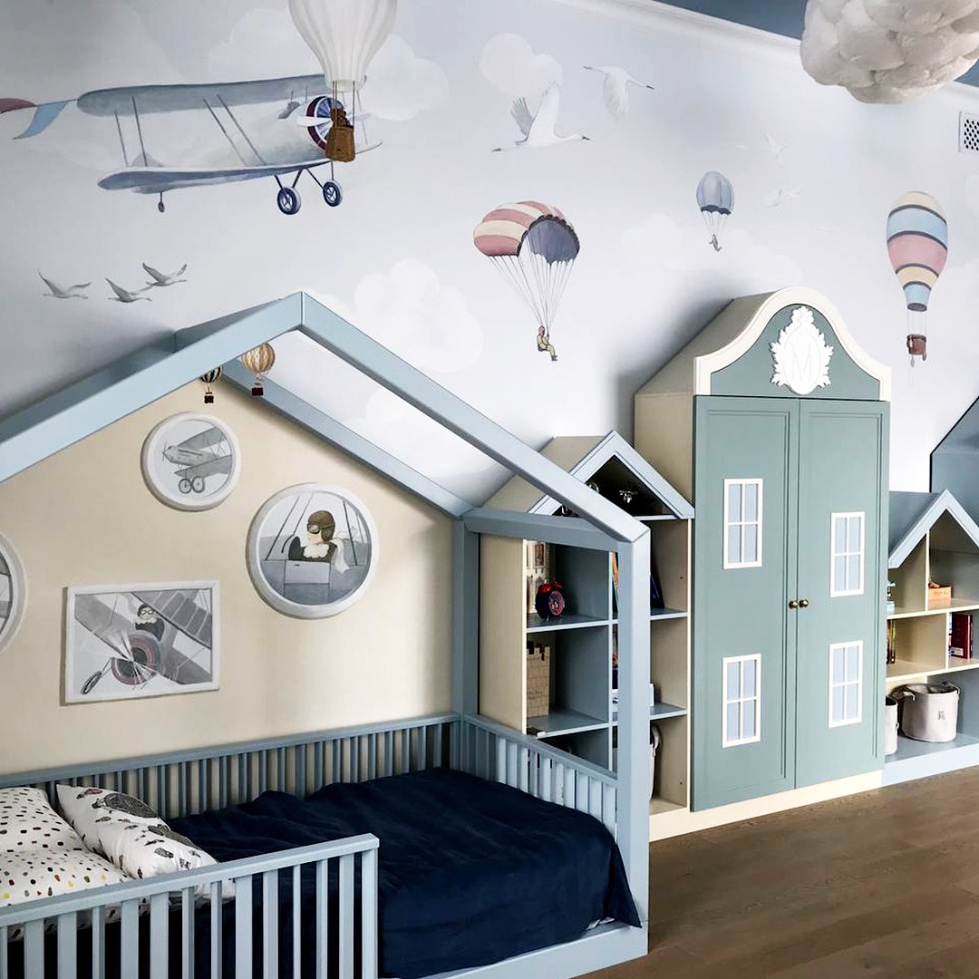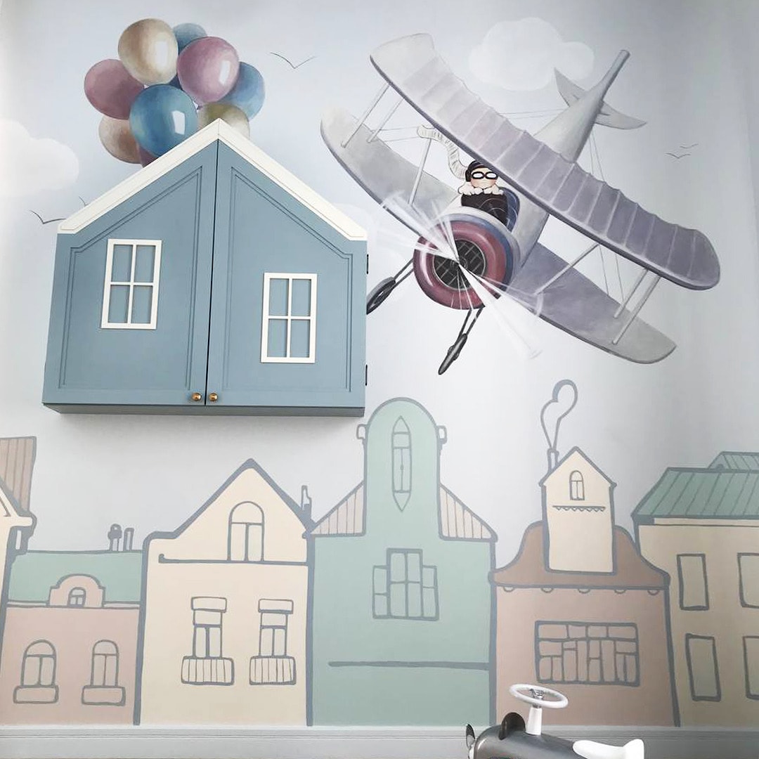 Главной изюменкой проекта художниц стала роспись стен в авиа тематике: выдержанность основной темы интерьера комнаты, гармоничные оттенки и целая история на стенах, которую хочется рассматривать и детям, и взрослым.