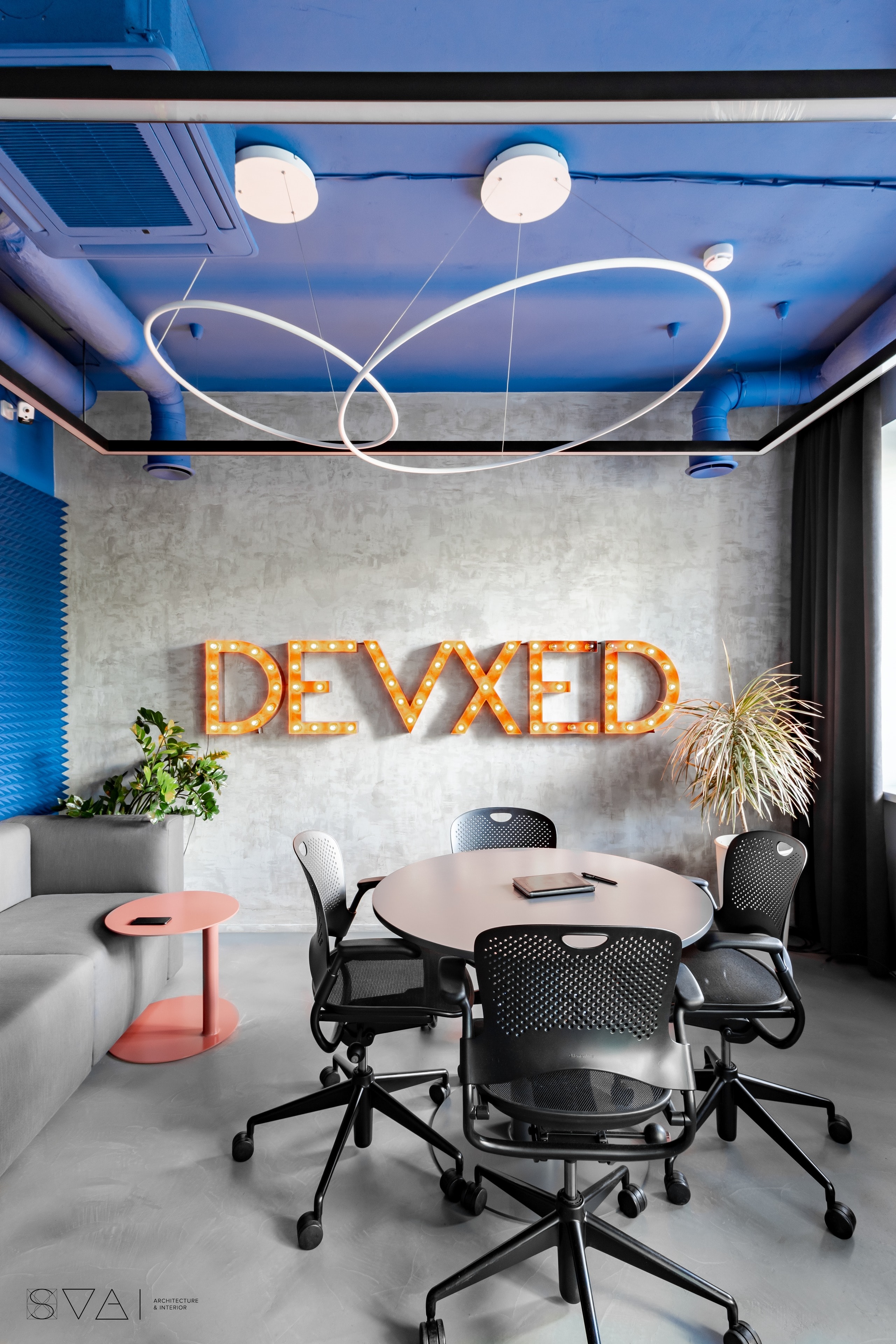 Основная задача проекта: создать комфортное пространство для работы и отдыха сотрудников Devxed. Избавившись от перегородок и подвесного потолка, помещение стало просторнее, а открытые коммуникации определили индустриальную стилистику проекта.