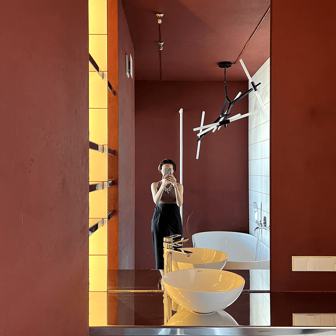 Цветовая палитра пространства навеяна красно-бордовыми тонами первой сцены "Сияния" Стенли Кубрика, так сложилось настроение ванной зоны. Для общего пространства акцентом стал углубленный футуристический фиолетовый из "Заводного апельсина". Динамику помещению придают оттенки металла, структурные поверхности, небрежная лессировка. Таким образом удалось создать нечто камерное, с доверием к сложным оттенкам.