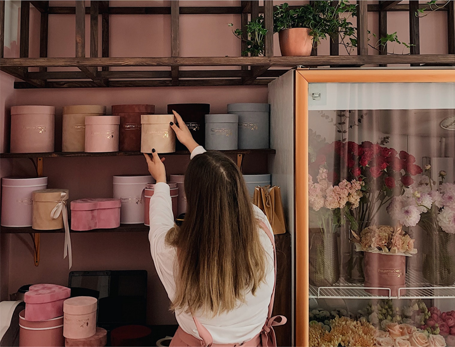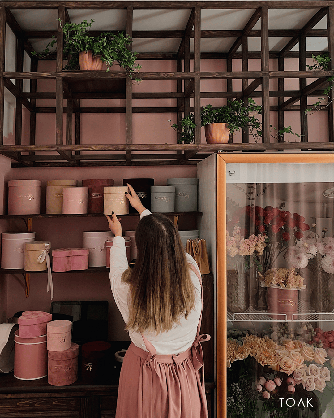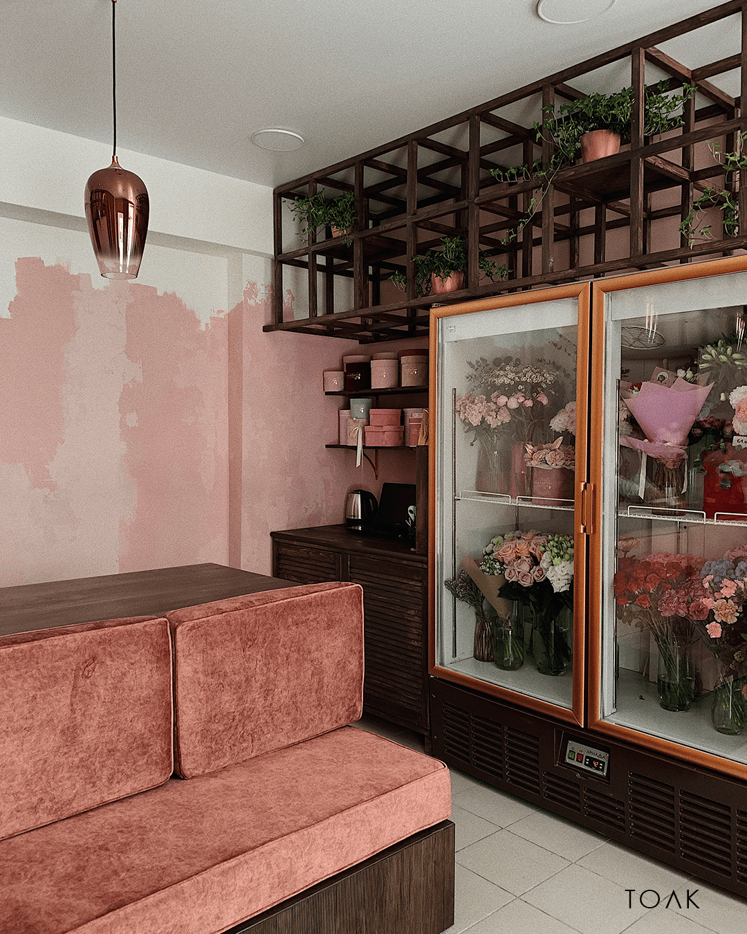 Над дизайном букетной работала студия @tolk.work. Основной акцент помещения сделан на интерьерной росписи стены в рабочей зоне, которую выполнила художница и декоратор @dubrovskaya7. Букетная реализована в гармоничных благородных оттенках Borolo 65 и Borolo 115, использована стойкая экологичная краска #Amphibolin.