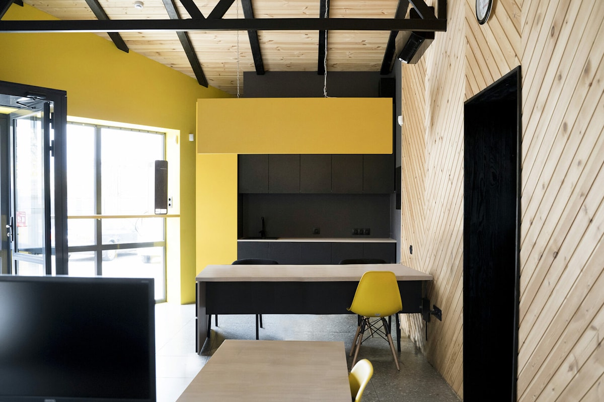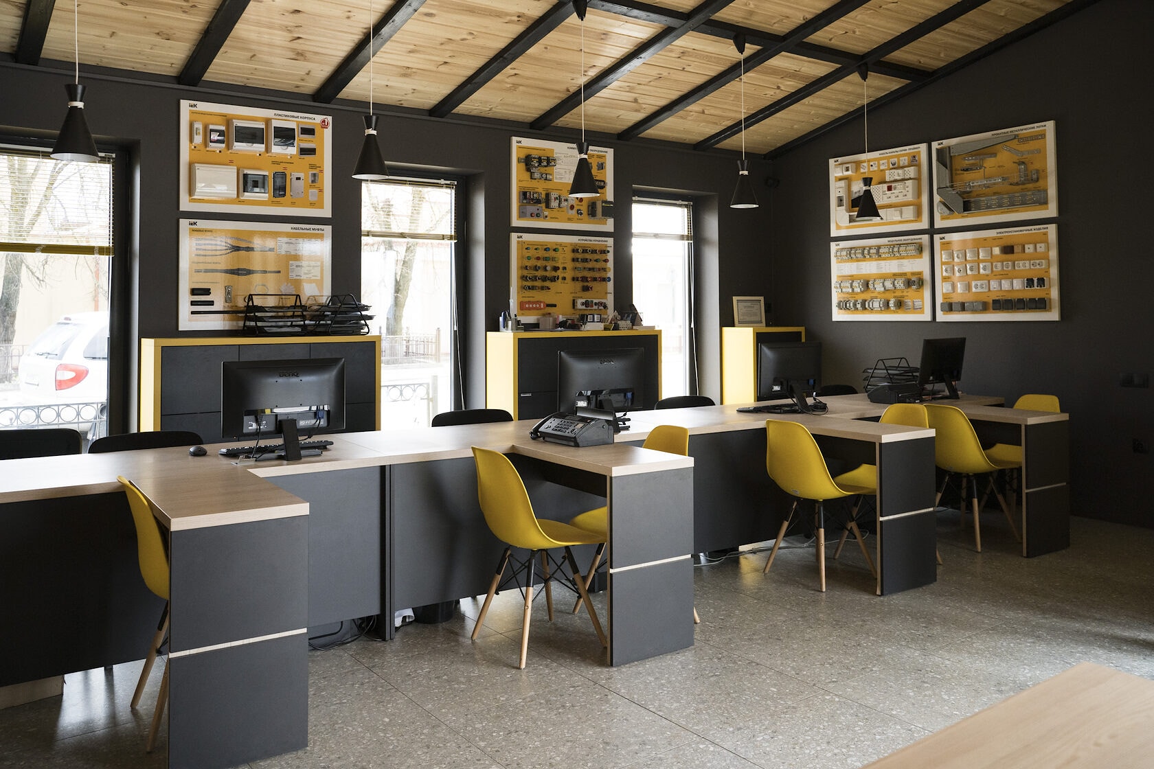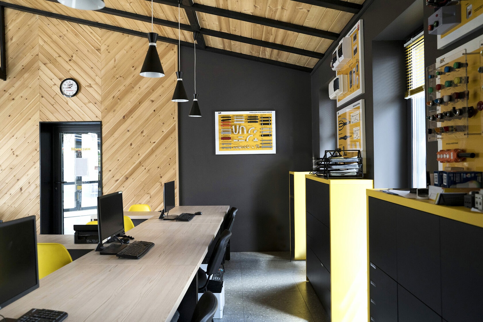Актуальное сочетание желтого и графита, современная мебель, четкие графичные линии и минимализм - все это стало гармоничным решением для создания офисного пространства магазина электрики @electrica_brest.