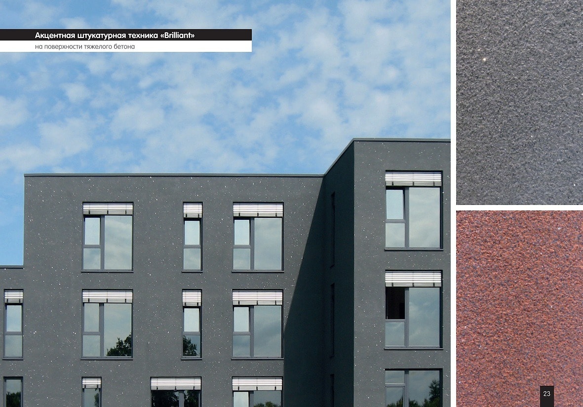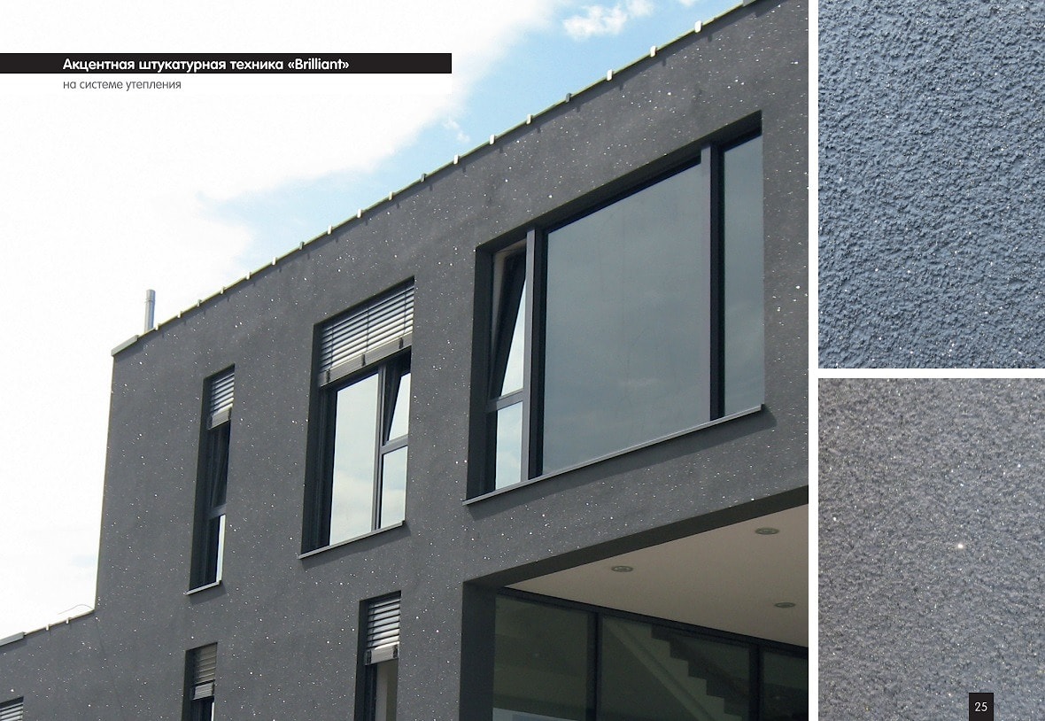 После высыхания наносится 2-й слой краски Caparol ThermoSan NQG (Капарол Термосан НКГ). Сразу после этого на еще свежую окрашенную поверхность наносится Capatect Kreativeffekt Brilliant (Капатект Креативэффект Бриллиант) с помощью воронкообразного пистолета (диаметр сопла 4–6 мм). Для достижения максимально равномерного эффекта материал следует наносить равномерным движением и на расстоянии от поверхности фасада. Воздушный компрессор должен иметь производительность по воздухозабору не менее 600 л/мин.