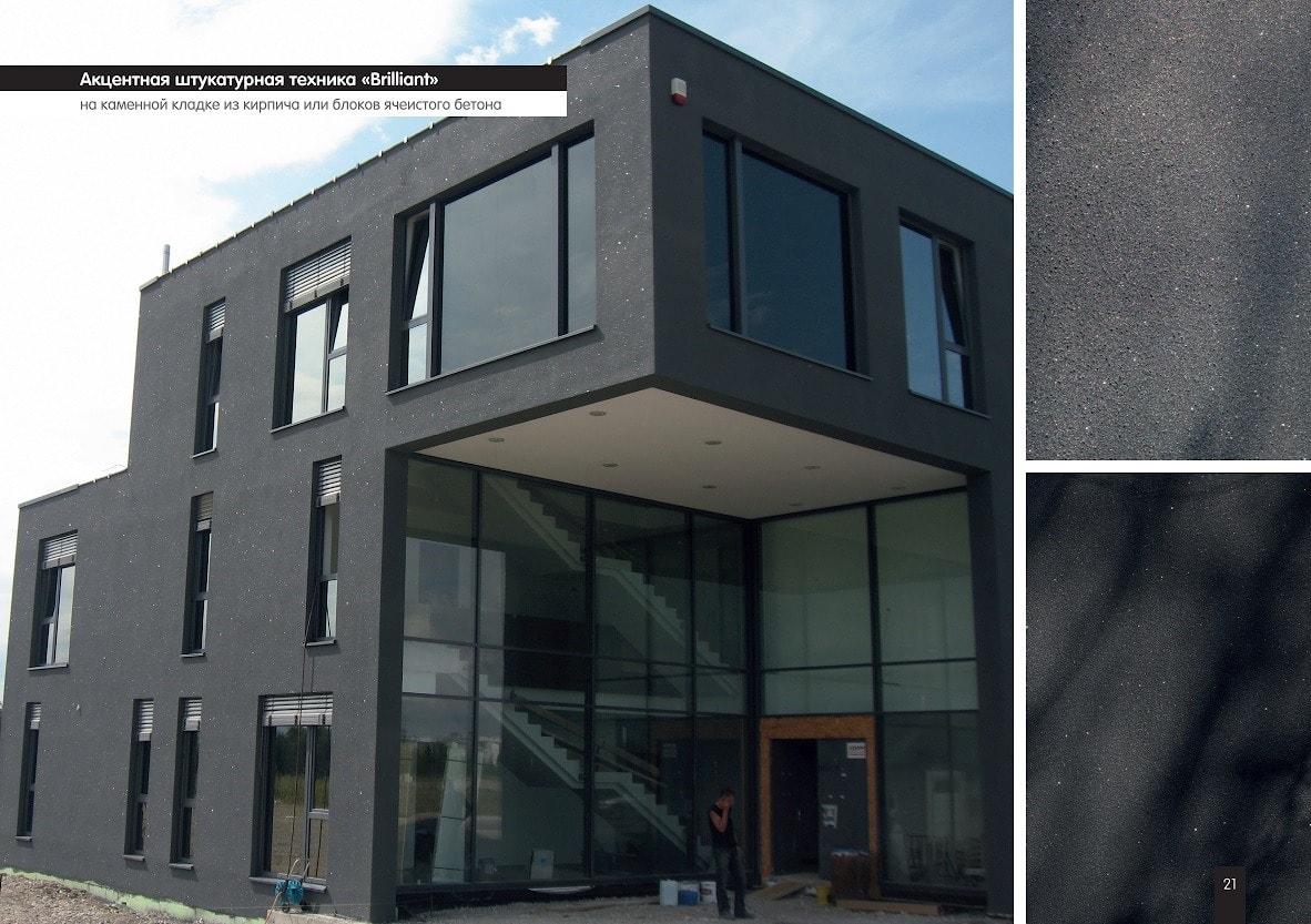 Перед началом производства работ рекомендуется выполнить декоративное покрытие на небольшом участке фасада и согласовать его с заказчиком и проектировщиком (дизайнером). При нанесении декоративного покрытия может образовываться небольшой облачный вид. Этот эффект более заметен на светлых тонах штукатурки, чем на темных. Поэтому мы рекомендуем оттенки темного диапазона светлоты.