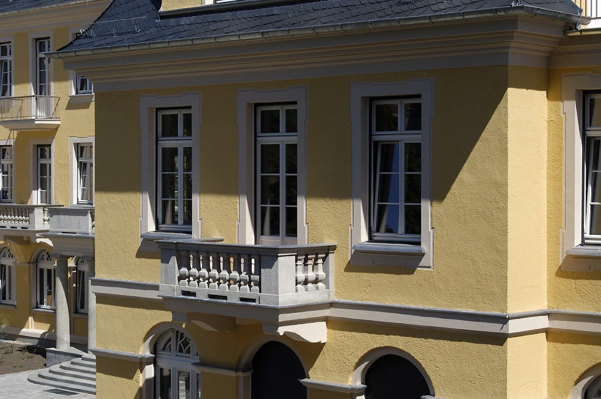 Для ремонта штукатурки особенно хорошо подходят готовые сухие строительные растворы на основе трассо-известково-цементного состава. Места, где было проведено исправление дефектов, должны перед окраской хорошо сцепиться и просохнуть. Все отремонтированные участки следует покрыть флюатированием продуктом Histolith® Fluat и промыть. При этом следует обратить внимание на то, чтобы флюатирование выходило на 1-2 ширины кисти за участок ремонта. На больших участках, где необходимо устранить дефекты штукатурки, следует всегда флюатировать всю поверхность (старая и новая штукатурка), а затем промывать ее.