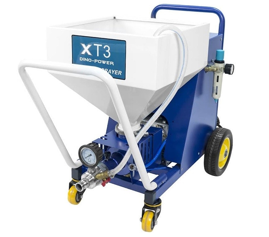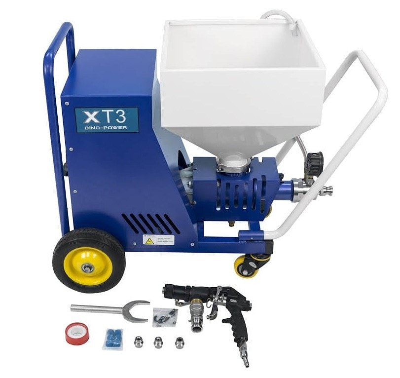 DP-T3 представляет собой штукатурную станцию с винтовым насосом, оснащенную бункером из нержавеющей стали. Станция предназначена для подачи пастообразных веществ и растворов зернистостью до 3 мм, среди которых шпатлевка, цементная штукатурка, клеевые составы и другие материалы. Для смешивания смесительный винт и насос приводятся в движение редукторным двигателем. Далее готовый раствор подается шнековым насосом, который дополнительно подключен к смесительному винту. На конце подающего рукава установлен растворный пистолет. Растворный пистолет имеет в комплекте сопла разных диаметров для нанесения составов различной вязкости. Сжатый воздух, необходимый для распыления, подается воздушным компрессором. Штукатурную станцию DP-T3 можно использовать для пневматического распыления материалов (в случае нанесения грунтовочного слоя или составов средней вязкости). Для этого на конце подающего рукава устанавливается пневматический пистолет.