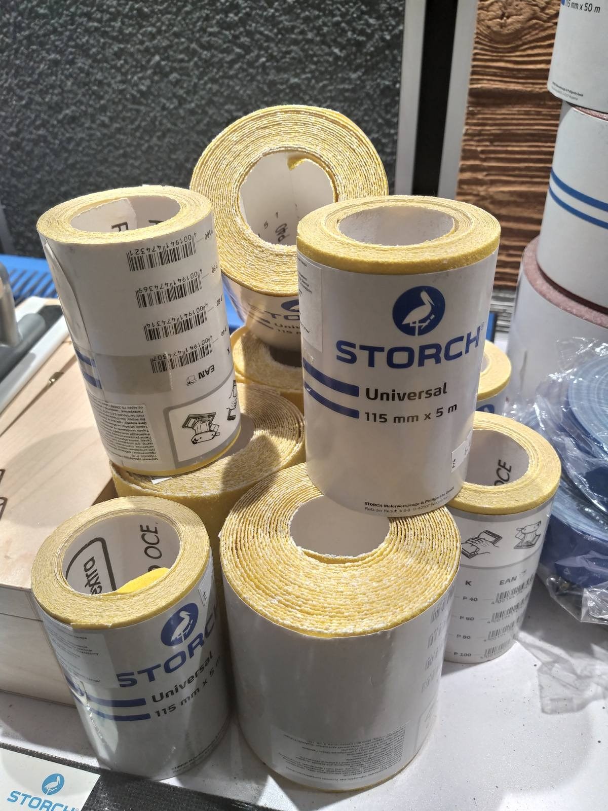 Рулонная шлифовальная бумага STORCH Universal-Schleifpapier размером 115 мм x 5 м, зернистость P 60. Универсальная, желтая. Арт.: 47 43 06. Шлифбумага изготовлена в Германии и используется для шлифования поверхностей в процессе производства малярных и других видов работ.