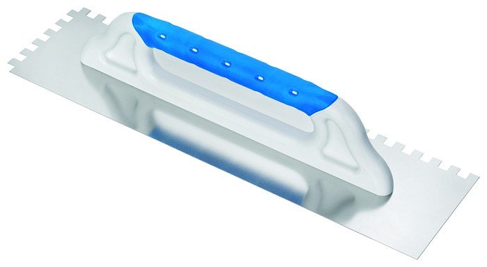 Зубчатая кельма из нержавеющей стали, с двухкомпонентной ручкой, с 7-ю выступами для пальцев. Размер: 480x130/0,7 мм, зуб 10х10. Арт.: 31 07 10.