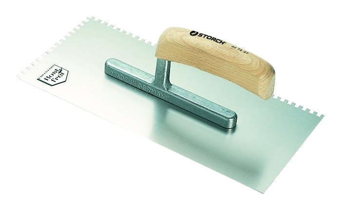 Зубчатый шпатель STORCH Edelstahl-Zahnkelle изготовлен из нержавеющей стали. Размер: 280 х 130 мм / 0,7 мм, зуб 6 х 6 мм. Нержавеющая сталь. Арт.: 32 71 18. Шпатель оснащен удобной деревянной ручкой.